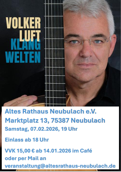 Kartenvorverkauf zu 15,00 € ab sofort im Café während den Öffnungszeiten oder per email an veranstaltung@altestrathaus-neubulach.de