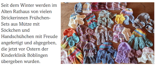 Der Handarbeitskreis trifft sich weiterhin regelmäßig Donnerstags von 14 bis 17 Uhr, um in gemütlicher Runde neue Modelle der aktuellen Kollektionen, Schultertücher, Socken … oder was immer das Herz begehrt, zu stricken oder häkeln.
